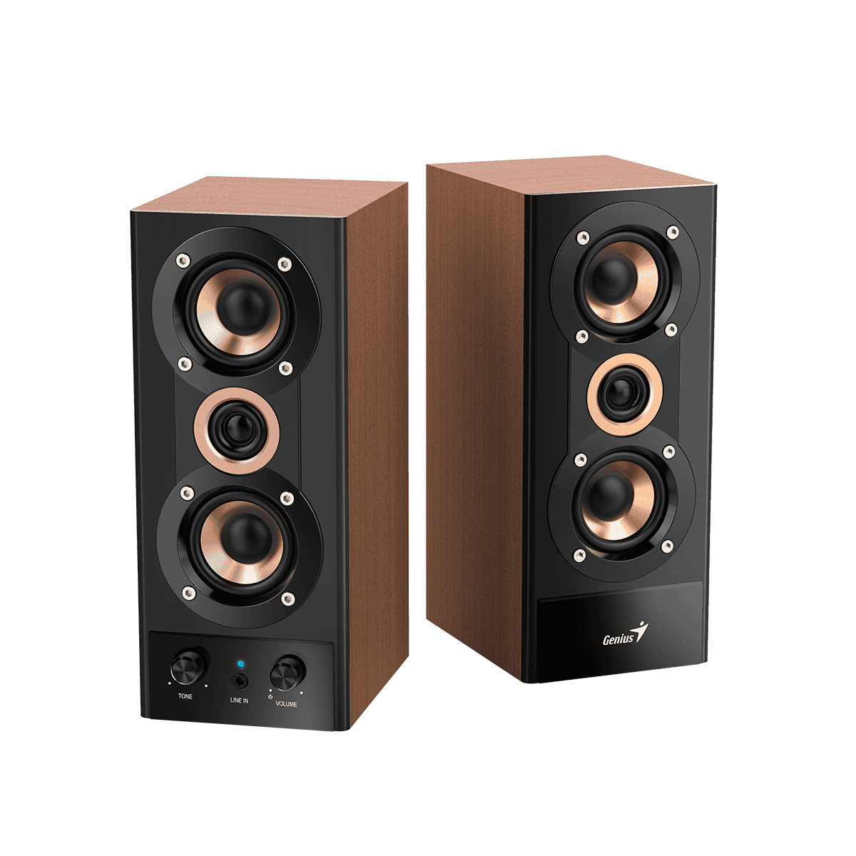 Měděné kužely a pozlacený kroužek spolu s dřevěným zbarvením dělají z tohoto reproduktoru stylový doplněk vedle vašeho počítače.