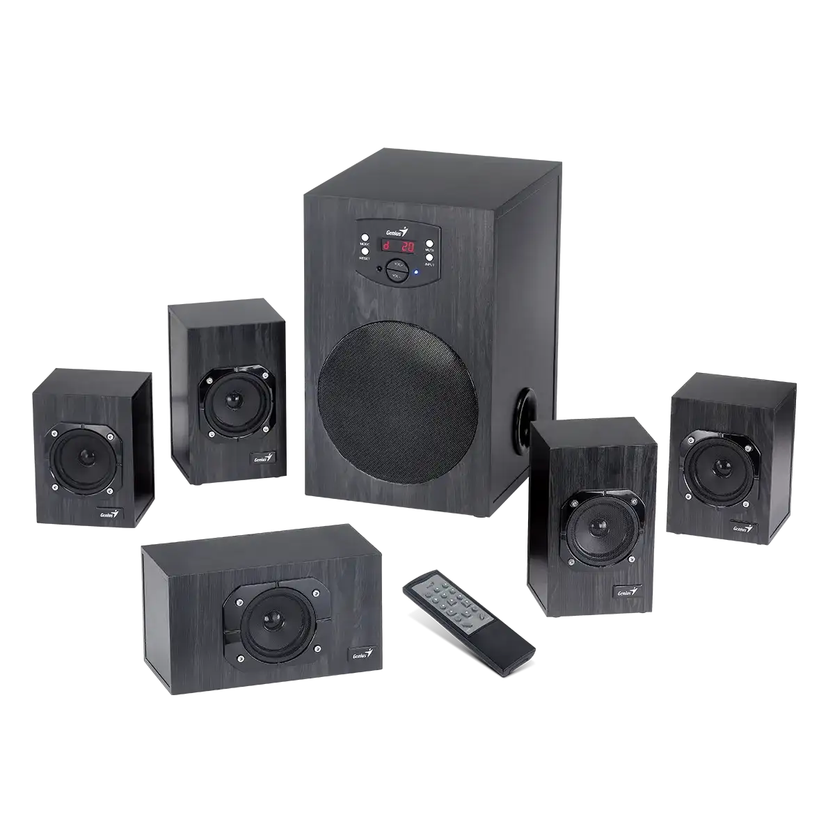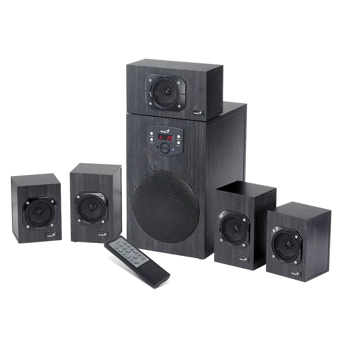 Эта 6-компонентная система объемного звука 5.1 канала имеет стильный дизайн и включает пять спутниковых колонок и один большой сабвуфер, предназначенный для создания мощных басов.