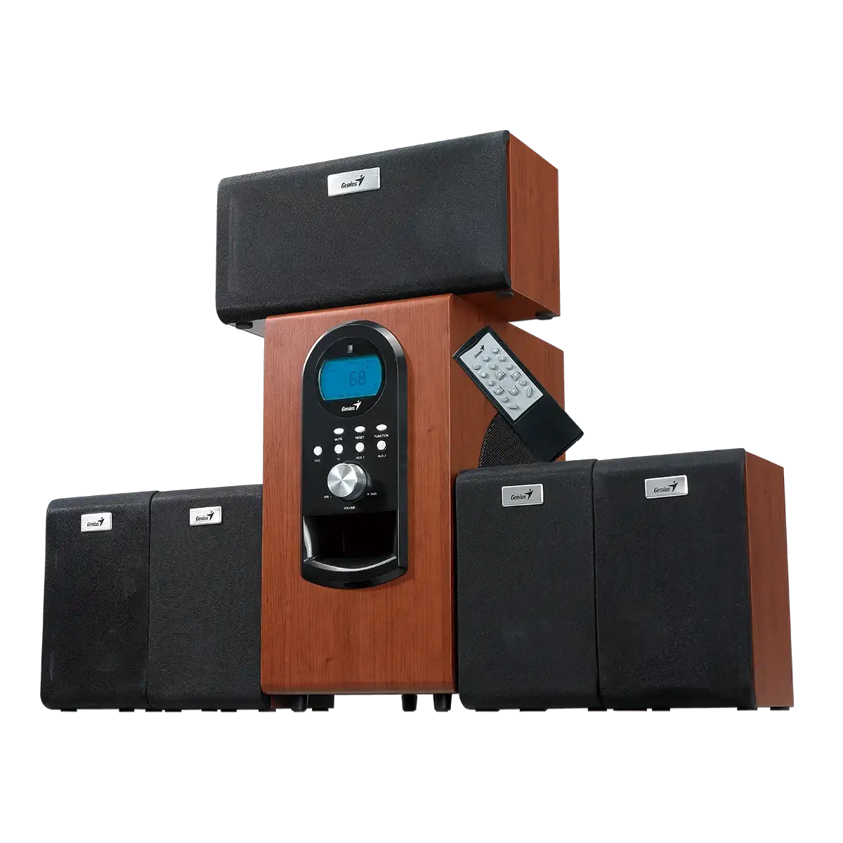 - Шестиголосая деревянная акустическая система домашнего кинотеатра с общей выходной мощностью 200 Вт RMS.