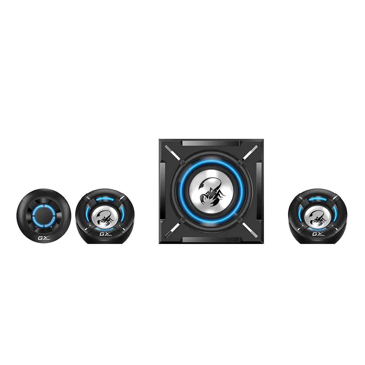 為了增強娛樂時的享受,背光藍光隨著背面強大的重低音增強的節奏不斷閃爍。並且,串聯背光用於調節音量,或連接到您的耳機或麥克風。這款 SW-G2.1 1000 喇叭非常