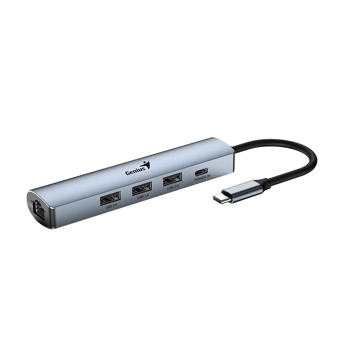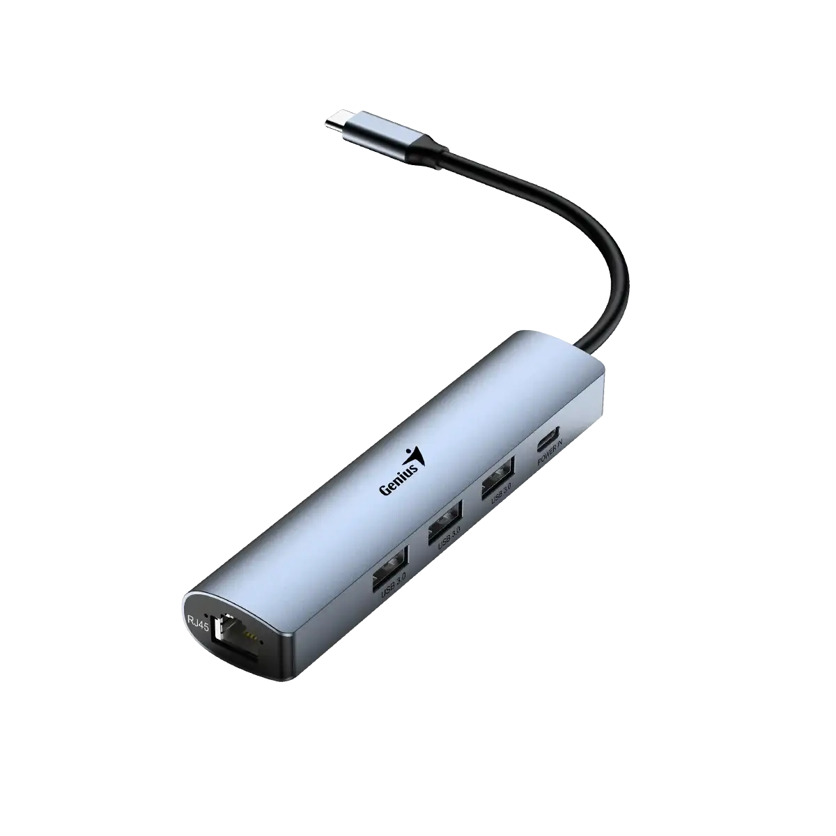 Genius UH-545 專為終極多功能性而設計,配備 5 個常用連接埠和 15 公分電纜。其中包括 1 個千兆乙太網路 RJ45 輸出、1 個 TYPE-C 電源連接埠和 3 個 USB-A 3.0 資料連接